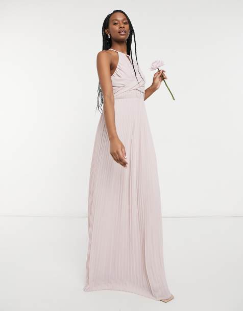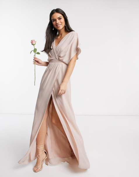 About Our Bridesmaid Dresses. Bridesmaid pleated long sleeve maxi dress. Bridesmaid short sleeved cowl front maxi dress with button back detail in blush 103.